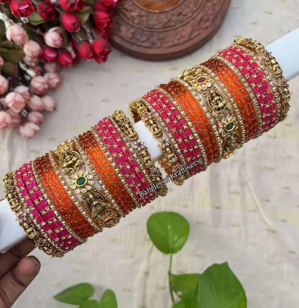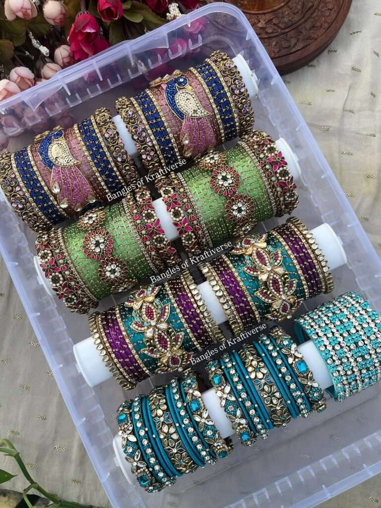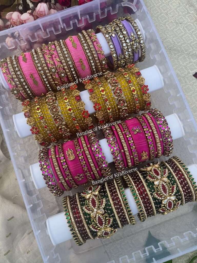 Brides across India are embracing custom bridal silk thread bangles for mehndi, haldi, and sangeet ceremonies. These bangles are often made to match the bridal lehenga or saree. Many brides prefer sets in maroon, gold, green, and red tones — colors that signify prosperity and love.