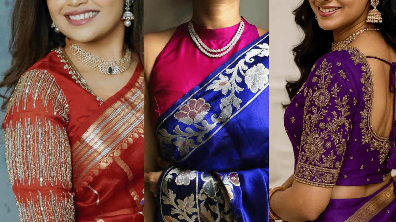 Vintage puff sleeves are back in trend, especially with temple jewellery and traditional buns. For a modern touch, ruffled sleeves or frilled shoulder detailing are making their way into saree styling.